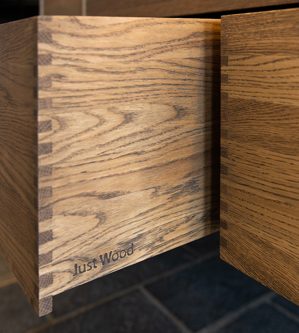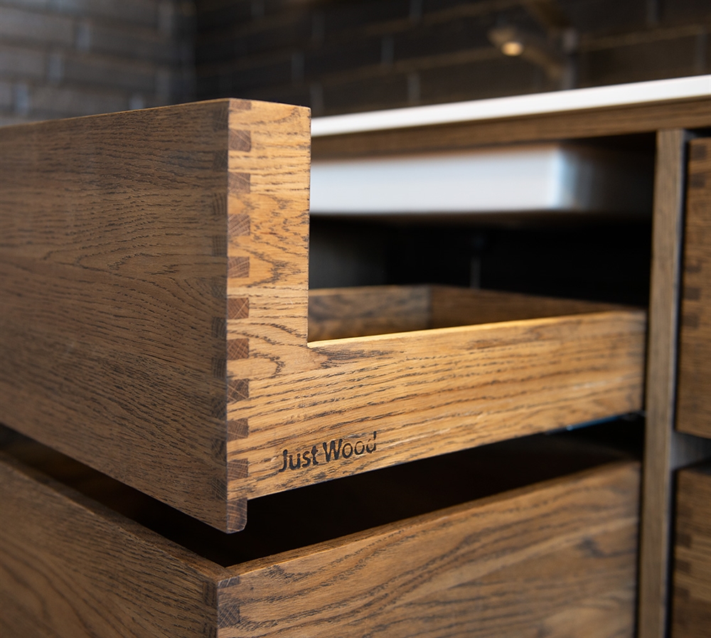 Just Wood Mørkeoljet Original snedker baderomsmøbler er et vakkert og unikt snekkerprodukt, som vil få badet ditt til å skille seg ekstremt skarpt ut med de beste materialene.