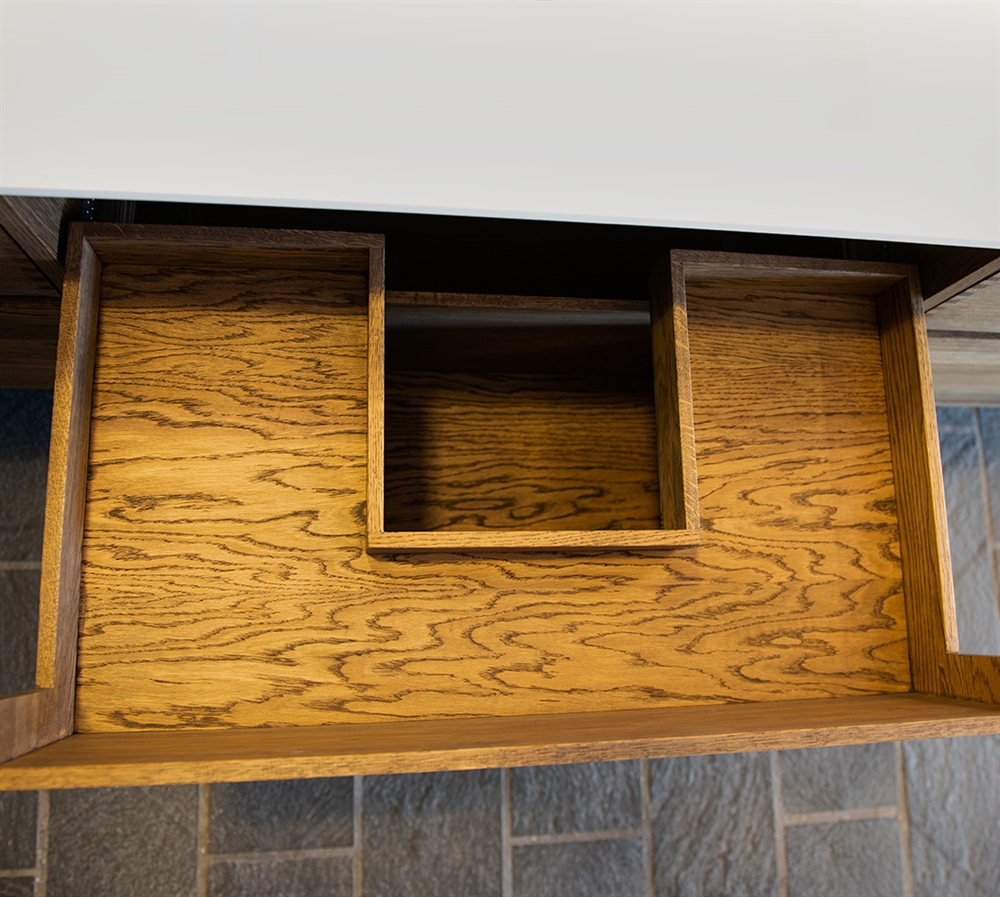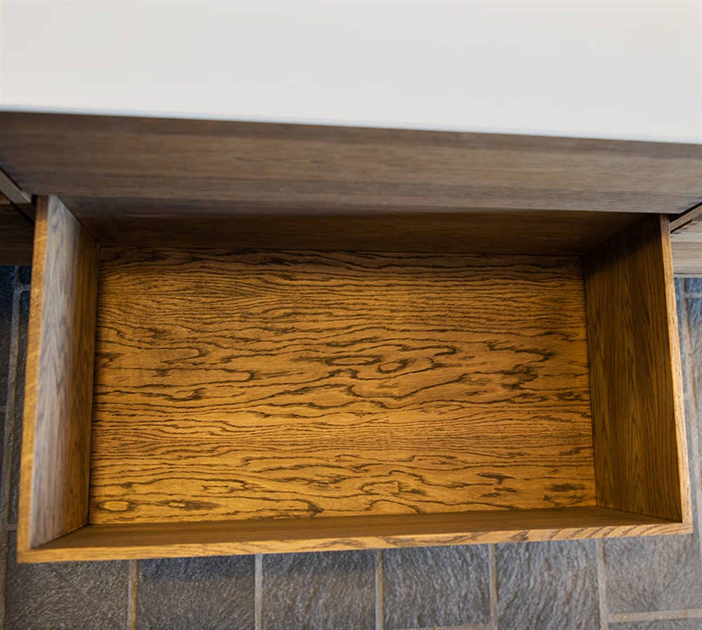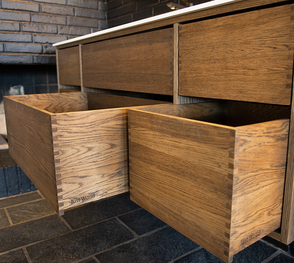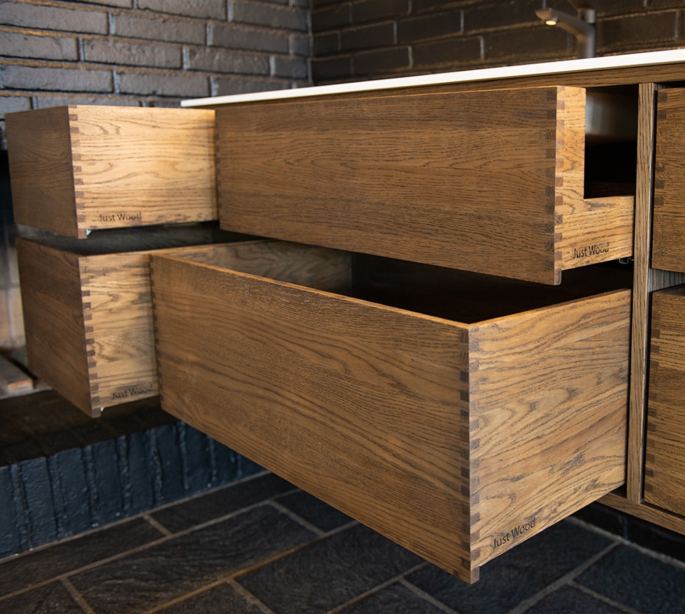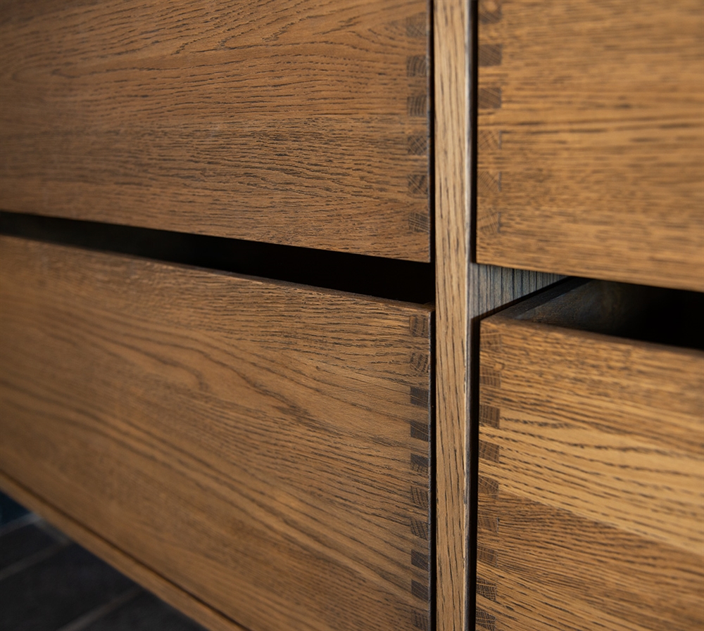 Dette snekkerbaderomsmøblet har 6 skuffer - 4 mindre skuffer og 2 store. Baderomsmøblene er laget med solide, oljete og fingertappende treskuffer i eik med vakre detaljer. Skuffene er laget med fullt uttrekk og soft close og kommer med vaskutskjæring i øverste skuff i midten og full dybde i nederste skuff.