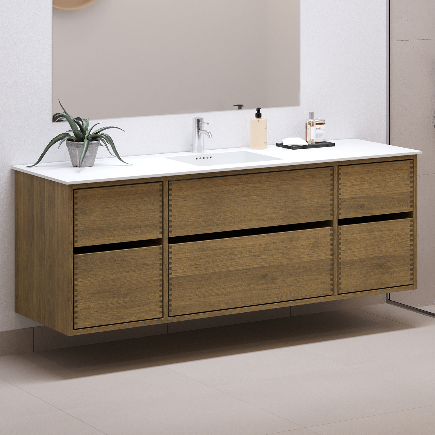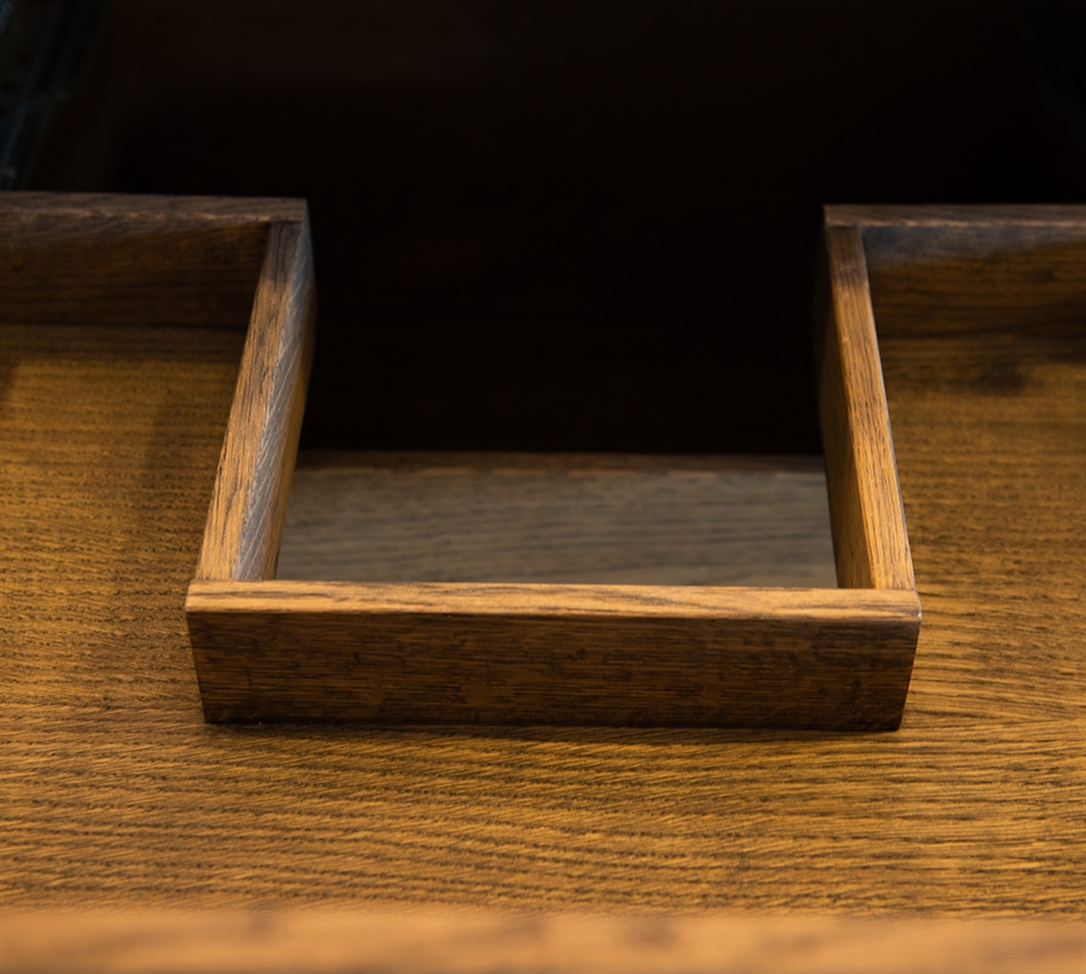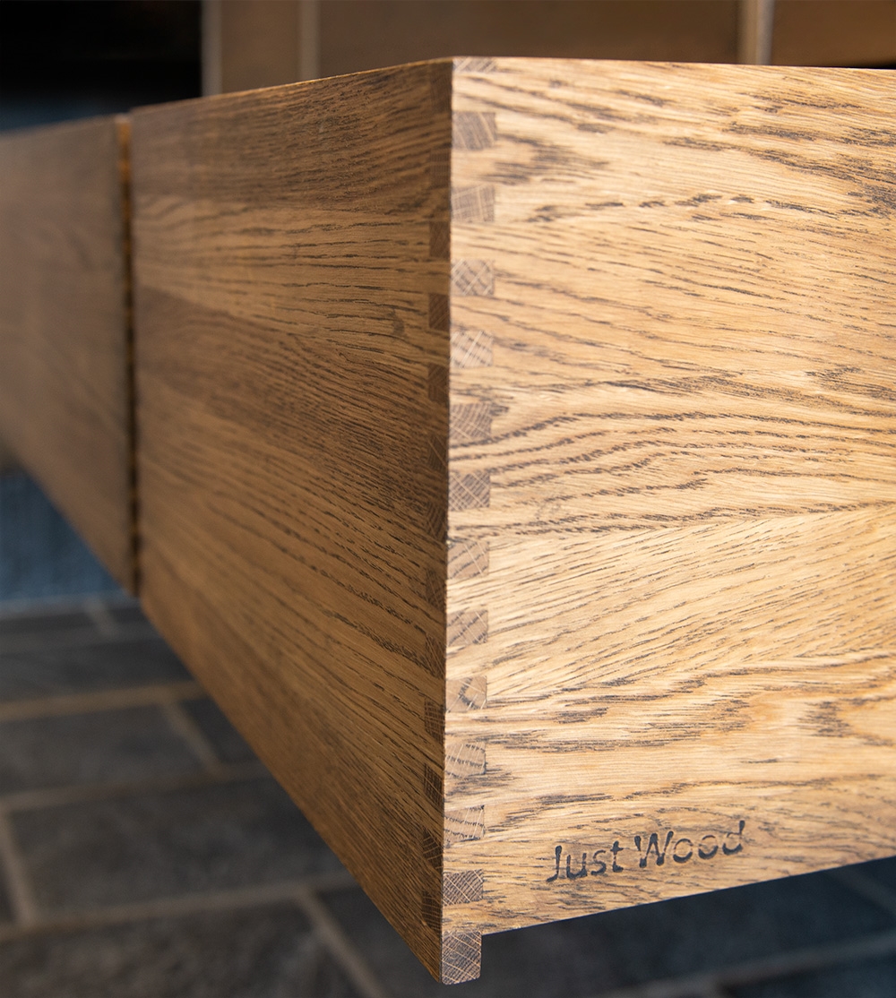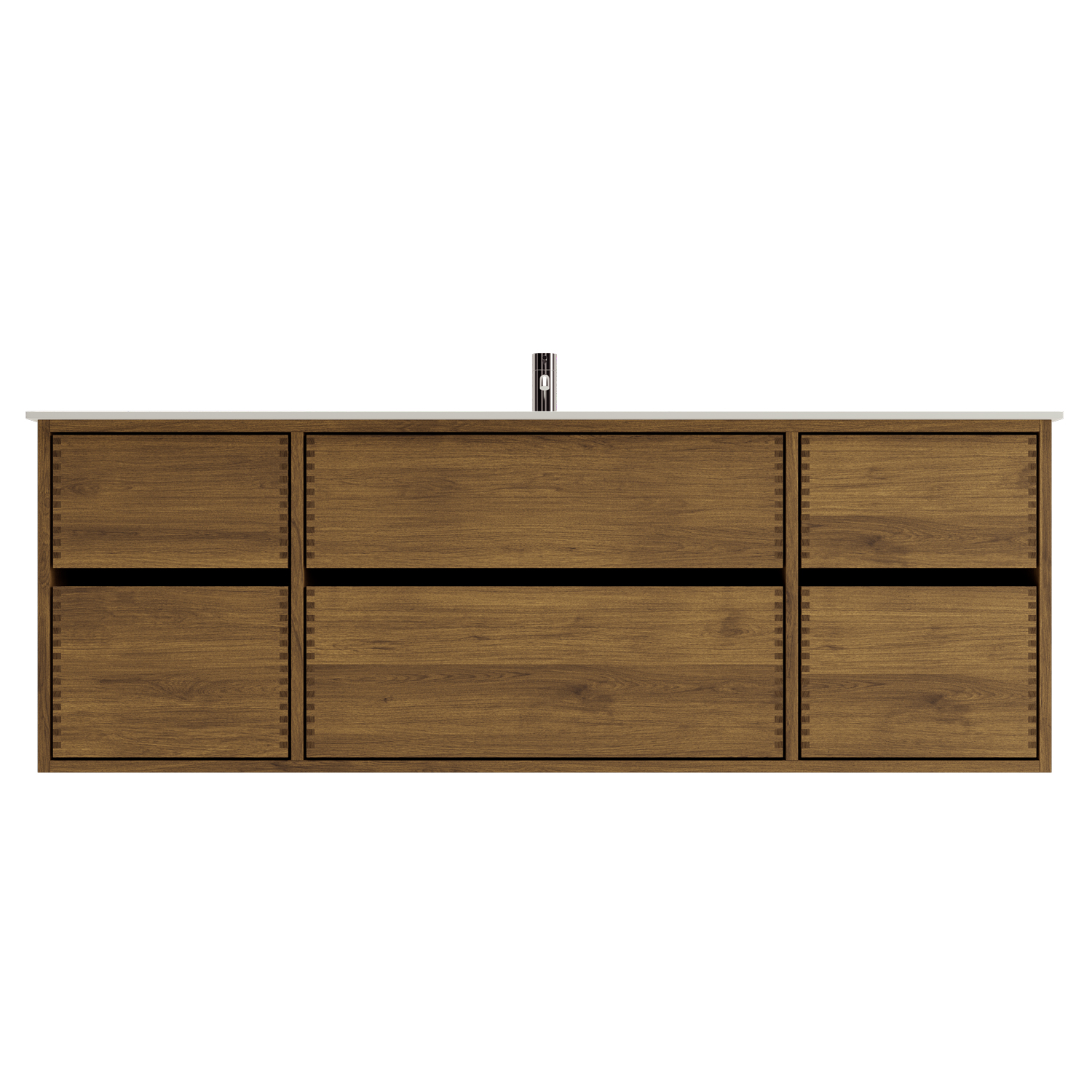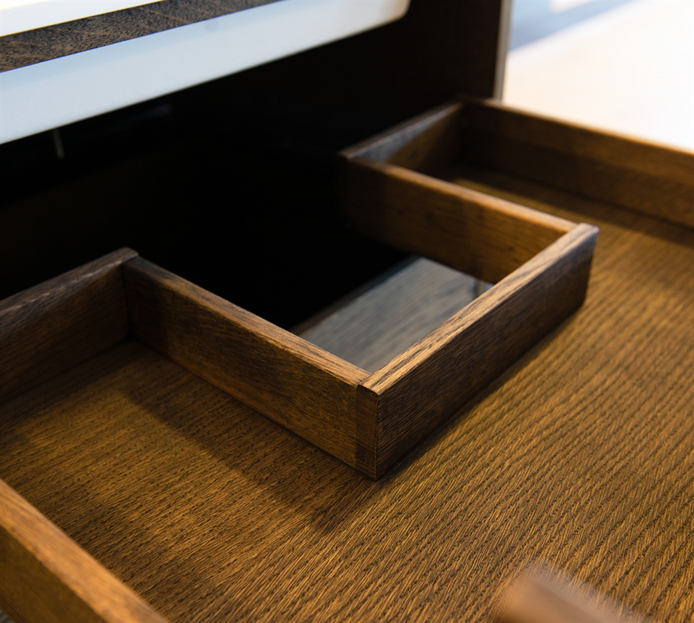 Dette snekkerbaderomsmøblet har 6 skuffer - 4 mindre skuffer og 2 store. Baderomsmøblene er laget med solide, oljete og fingertappende treskuffer i eik med vakre detaljer. Skuffene er laget med fullt uttrekk og soft close og kommer med vaskutskjæring i øverste skuff i midten og full dybde i nederste skuff.