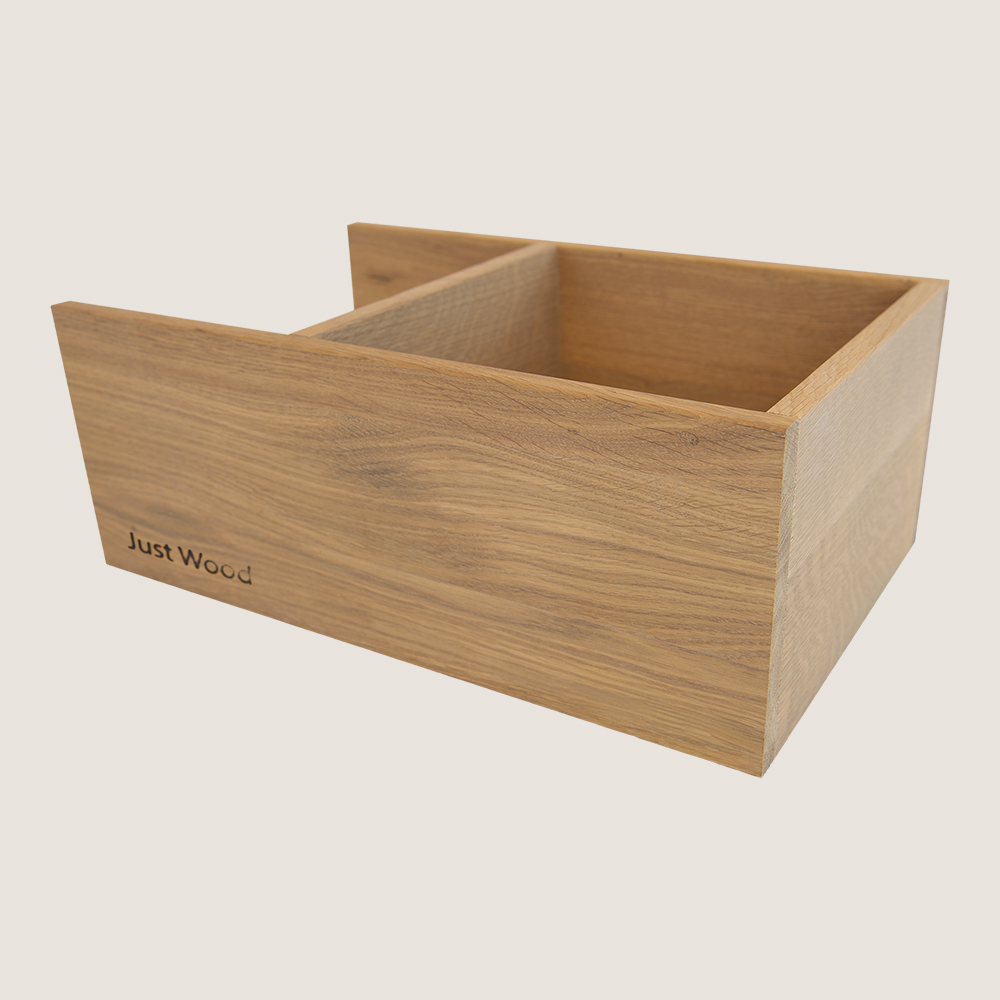 Just Wood skuffeinddeler leveres færdigsamlet og kan med fordel bestilles sammen med dit badmøbel for en gennemført og funktionel helhed.
